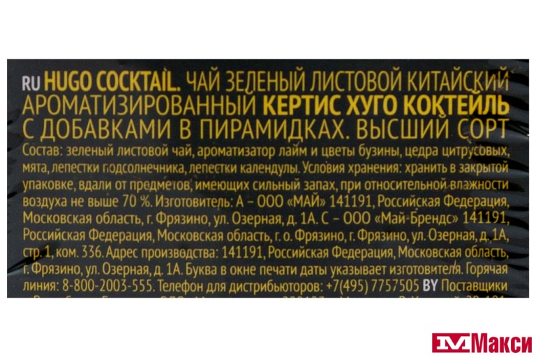 ЧАЙ "CURTIS" HUGO COCKTAIL ЗЕЛЕНЫЙ С МЯТОЙ, ЦЕДРОЙ ЦИТРУСОВЫХ, АРОМАТОМ ЛАЙМА И ЦВЕТОВ БУЗИНЫ 20 ПИРАМИДОК (МАЙ)