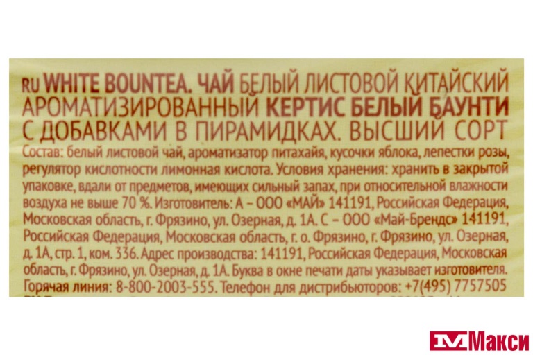ЧАЙ "CURTIS" WHITE BOUNTEA БЕЛЫЙ СО ВКУСОМ ПИТАХАЙИ 20 ПИРАМИДОК (МАЙ)