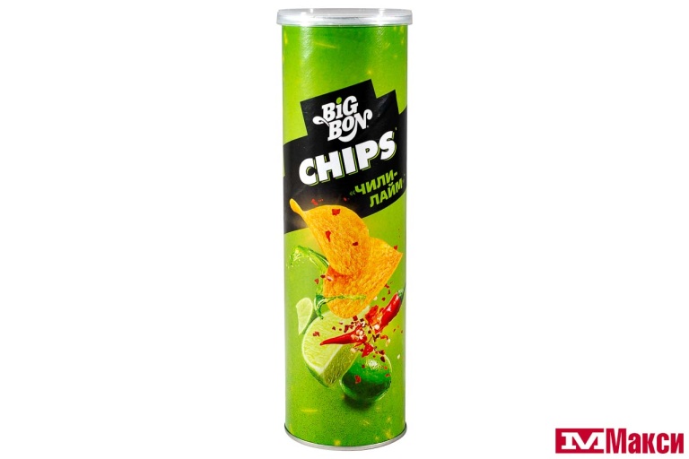 Картофельные чипсы BIGBON в тубе — это хрустящие и правильные по форме чипсы, в необычном сочетании перца чили и сочного лайма, их оценят даже самые требовательные гурманы.