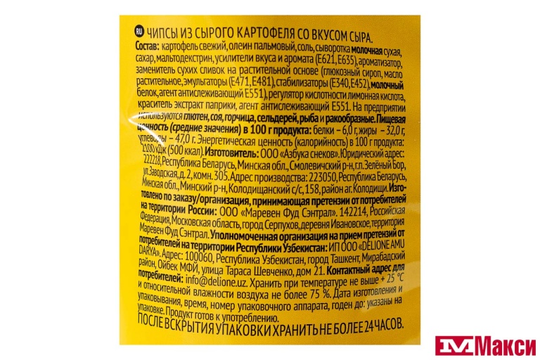 картофель свежий, олеин пальмовый, соль, сыворотка молочная сухая, сахар, мальтодекстрин, усилители вкуса и аромата (Е621, Е635), ароматизатор, заменитель сухих сливок на растительной основе (глюкозный сироп, масло растительное, эмульгаторы (Е471, Е481), стабилизаторы (Е340, Е452), молочный белок, агент антислеживающий Е551), регулятор кислотности лимонная кислота, краситель экстракт паприки, агент антислеживающий Е551. На предприятии используются глютен, соя, горчица, сельдерей, рыба и ракообразные.
