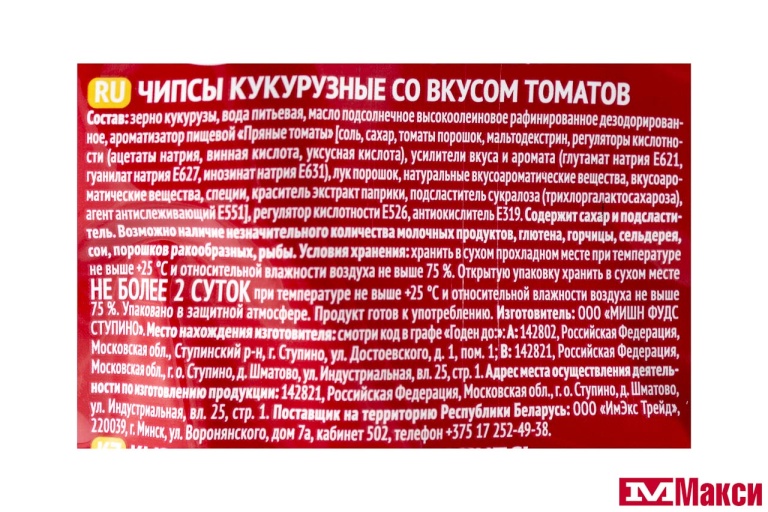 зерно кукурузы, вода питьевая, масло подсолнечное высокоолеиновое рафинированное дезодорированное, ароматизатор пищевой [соль, сахар, томаты порошок, мальтодекстрин, регуляторы кислотности (ацетаты натрия, винная кислота, уксусная кислота), усилители вкуса и аромата (глутамат натрия, гуанилат натрия, инозинат натрия), лук порошок, натуральные вкусоароматические вещества, вкусоароматические вещества, специи, краситель экстракт паприки, подсластитель сукралоза (трихлоргалактосахароза), агент антислеживающий Е551], регулятор кислотности Е526, антиокислитель Е319