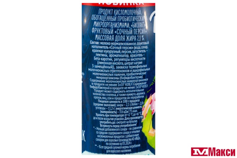 молоко нормализованное, фруктовый наполнитель «Сочный персик» (вода, концентрированный яблочный сок, персик (кусочки), крахмал кукурузный , загуститель – пектины , ароматизатор , краситель - каротины , регуляторы кислотности (лимонная кислота, цитрат натрия 3-замещённый)), закваска термофильных молочнокислых стрептококков и ацидофильных молочнокислых палочек, пробиотические микроорганизмы (бифидобактерии)