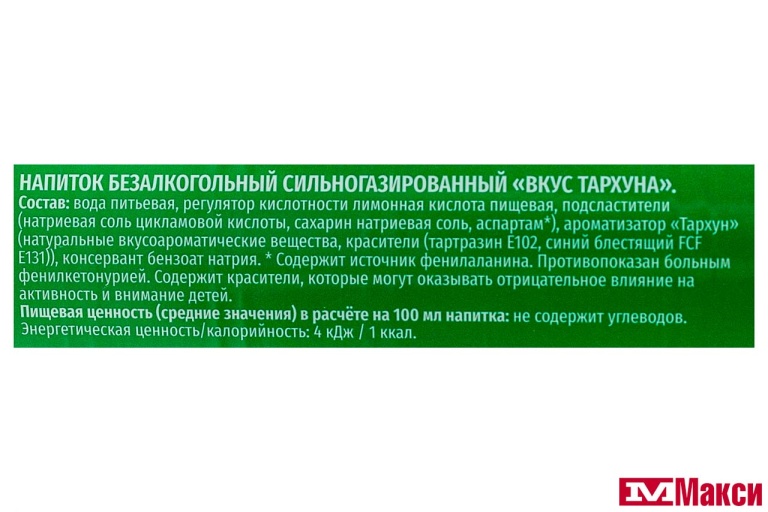 вода питьевая, регулятор кислотности лимонная кислота пищевая, подсластители (натриевая соль цикламовой кислоты, сахарин натриевая соль, аспартам*), ароматизатор "Тархун" (натуральные вкусоароматические вещества, красители (тартразин Е102, синий блестящий FCF E131)), консервант бензоат натрия