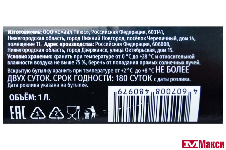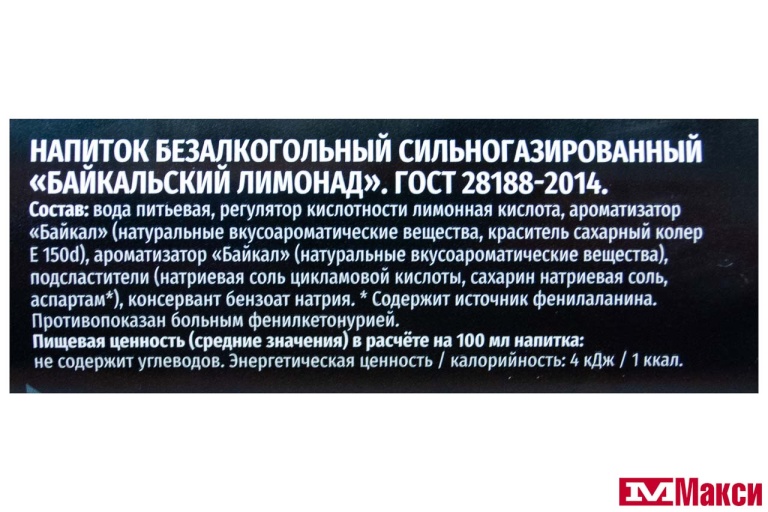 вода питьевая, регулятор кислотности лимонная кислота, ароматизатор «Байкал» (натуральные вкусоароматические вещества, краситель сахарный колер Е 150d), ароматизатор «Байкал» (натуральные вкусоароматические вещества), подсластители (натриевая соль цикламовой кислоты, сахарин натриевая соль, аспартам *), консервант бензоат натрия