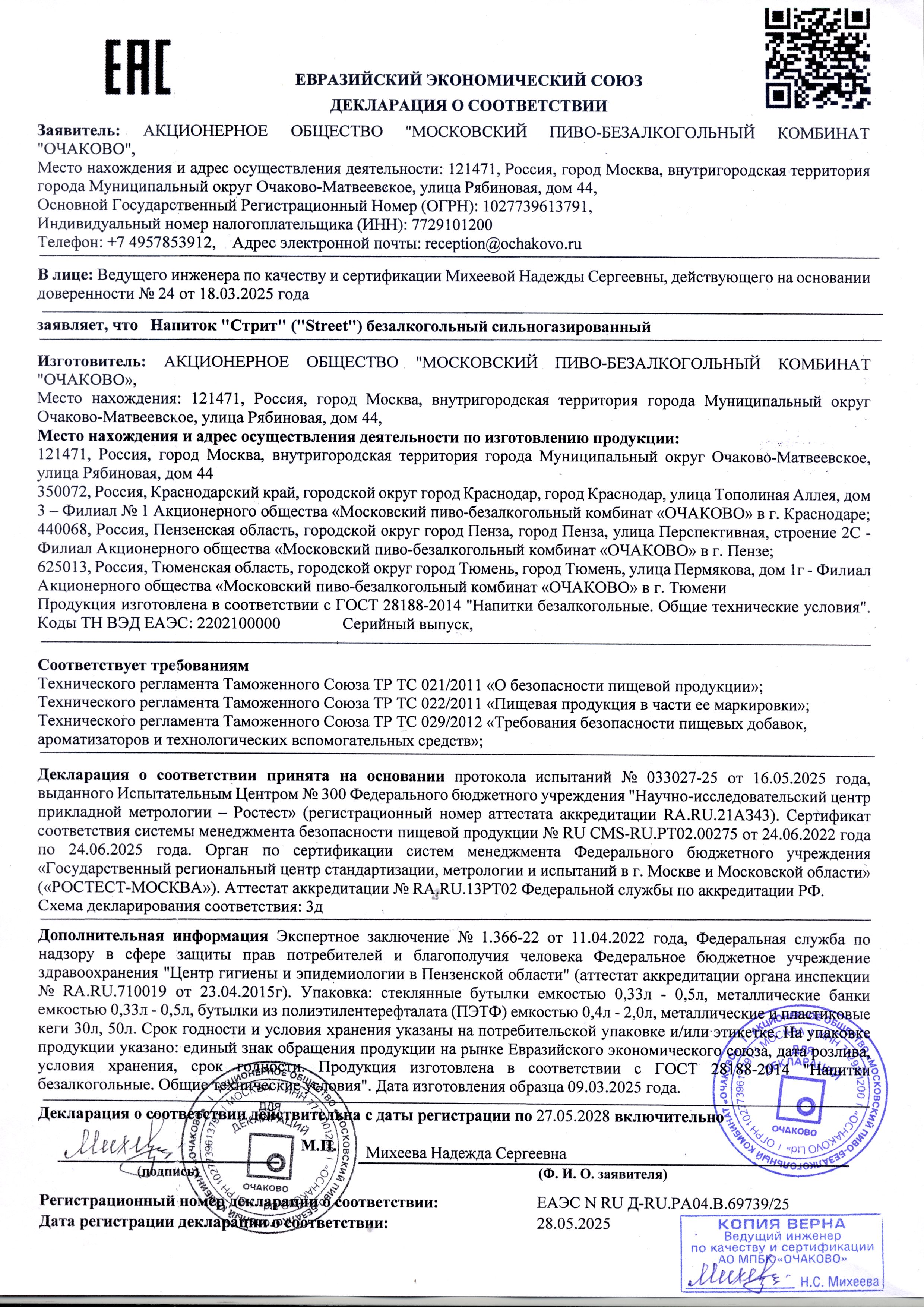 НАПИТОК СИЛЬНОГАЗИРОВАННЫЙ "STREET" 2Л ПЭТ (ОЧАКОВО)