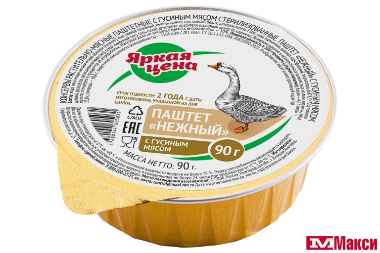 Консервы растительно-мясмные паштетные стерилизованные. Паштет «Из гусиного мяса" марки "Яркая цена" готовится из качественной печени с добавлением воды, крупы манной, лука, соли и пряностей. Из паштета готовятся отличные бутерброды.