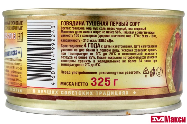 Консервы мясные кусковые в собственном соку стерилизованные, Массовая доля мяса и жира: не менее 56%.