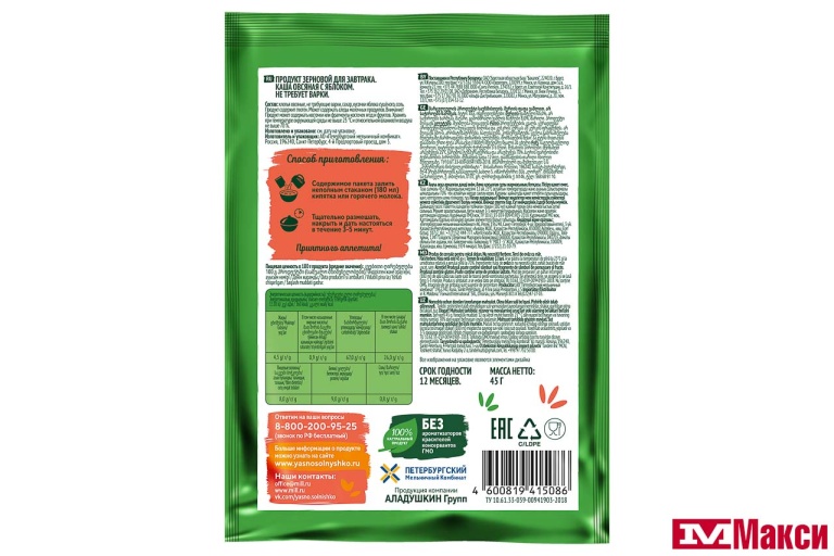 КАША ОВСЯНАЯ МОМЕНТАЛЬНАЯ "ЯСНО СОЛНЫШКО" С ЯБЛОКОМ 45Г