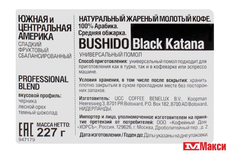 КОФЕ МОЛОТЫЙ "BUSHIDO" BLACK KATANA 227Г ПАКЕТ (НИДЕРЛАНДЫ) (ХОРС)