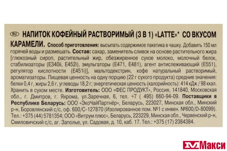 НАПИТОК КОФЕЙНЫЙ "МАК КОФЕ" 3В1 LATTE СО ВКУСОМ КАРАМЕЛИ 5Х22Г