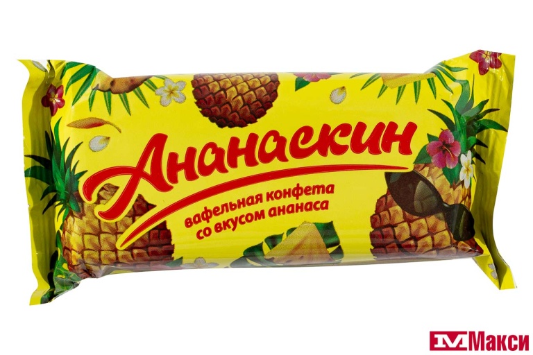 Классическая укрупненная вафельная конфета с кремовой начинкой со вкусом ананаса, покрытая глазурью.