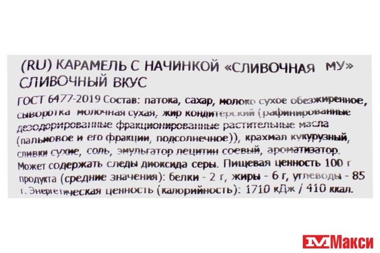 Патока, сахар, молоко сухое обезжиренное, сыворотка молочная сухая, жир кондитерский (рафинированные дезодорированные фракционированные растительные масла (пальмовое и его фракции, подсолнечное)), крахмал кукурузный, сливки сухие, соль, эмульгатор лецитин соевый, ароматизатор. Может содержать следы диоксида серы