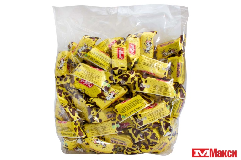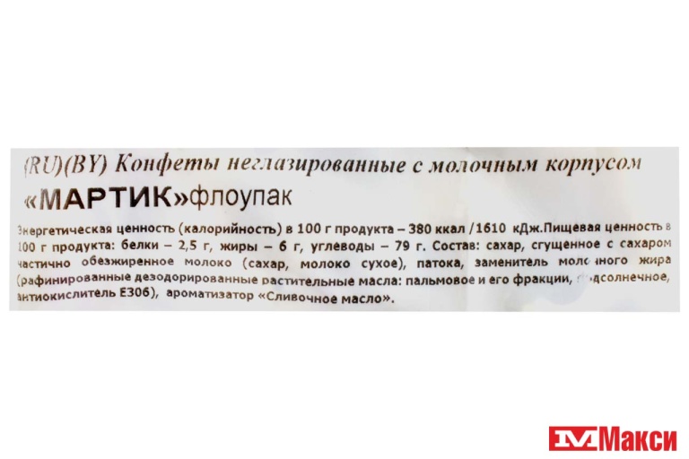 Сахар, сгущенное с сахаром частично обезжиренное молоко (сахар, молоко сухое), патока, заменитель молочного жира (рафинированные дезодорированные растительные масла: пальмовое и его фракции, подсолнечное, антиокислитель Е306), ароматизатор "Сливочное масло"