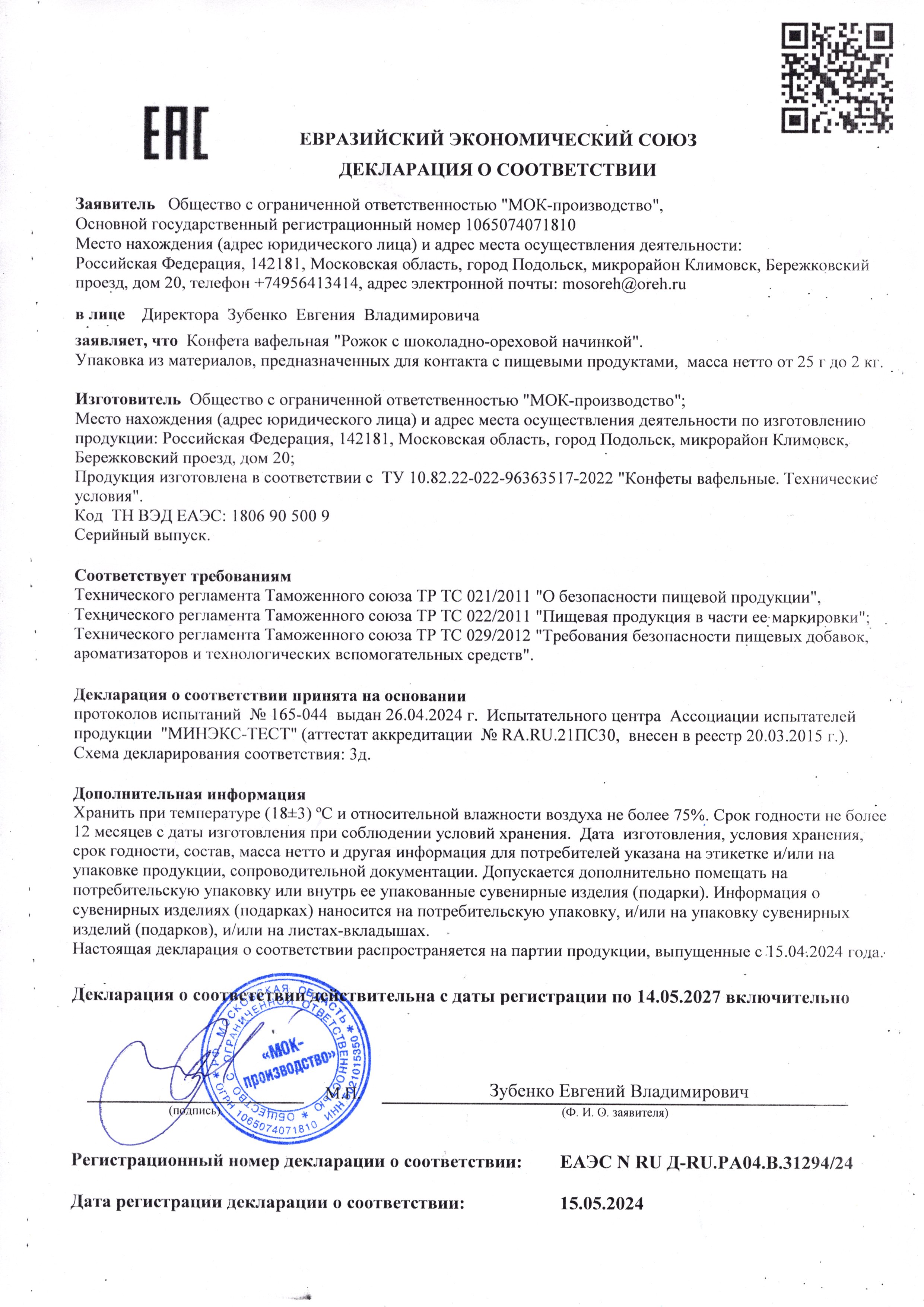 Хрустящий вафельный рожок с щедрой порцией вкуснейшей шоколадно-ореховой начинки.