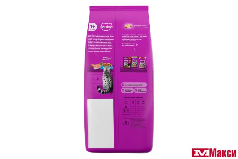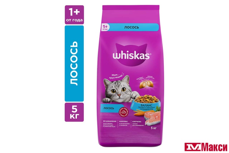 Это сбалансированный рацион для здоровой и счастливой жизни Вашей кошки. Хрустящие подушечки с нежным паштетом внутри обязательно придутся по вкусу Вашей любимице. Кроме того, Whiskas содержит все необходимое, чтобы еда Вашей кошки была не только вкусной, но и полезной. Whiskas это: Оптимальное сочетание питательных веществ и нутриентов для подержания обмена веществ Витамин Е и цинк для иммунитета Омега-6 и цинк для здоровья кожи и шерсти Баланс кальция и фосфора для здоровья костей Витамин А и таурин для хорошего зрения Высокоусваиваемые ингредиенты и клетчатка для пищеварения Сухая текстура корма для удаления зубного налета.