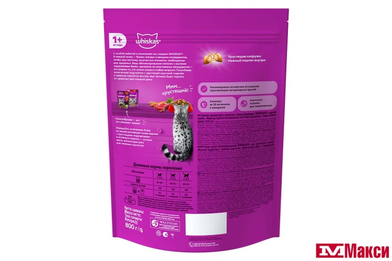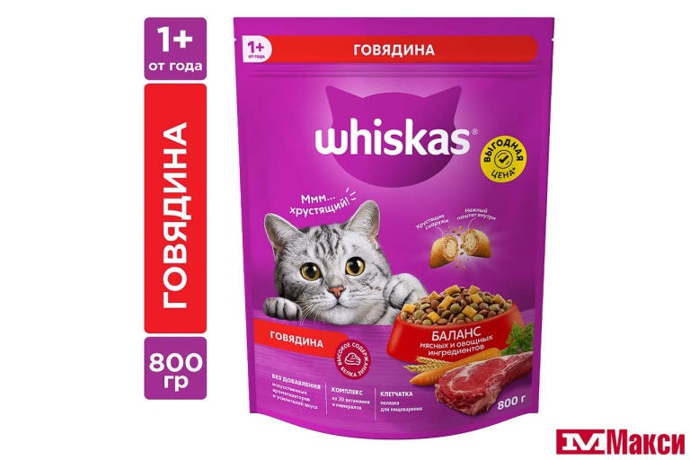Это сбалансированный рацион для здоровой и счастливой жизни Вашей кошки. Хрустящие подушечки с нежным паштетом внутри обязательно придутся по вкусу Вашей любимице. Кроме того, Whiskas содержит все необходимое, чтобы еда Вашей кошки была не только вкусной, но и полезной. Whiskas это: Оптимальное сочетание питательных веществ и нутриентов для подержания обмена веществ Витамин Е и цинк для иммунитета Омега-6 и цинк для здоровья кожи и шерсти Баланс кальция и фосфора для здоровья костей Витамин А и таурин для хорошего зрения Высокоусваиваемые ингредиенты и клетчатка для пищеварения Сухая текстура корма для удаления зубного налета.