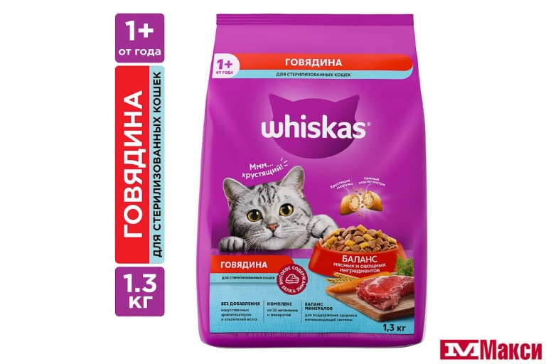 КОРМ ДЛЯ КОШЕК "ВИСКАС" ВКУСНЫЕ ПОДУШЕЧКИ 1,3КГ(д/стерилизованных кошек и котов с говядиной) - "д/стерилизованных кошек и котов с говядиной"