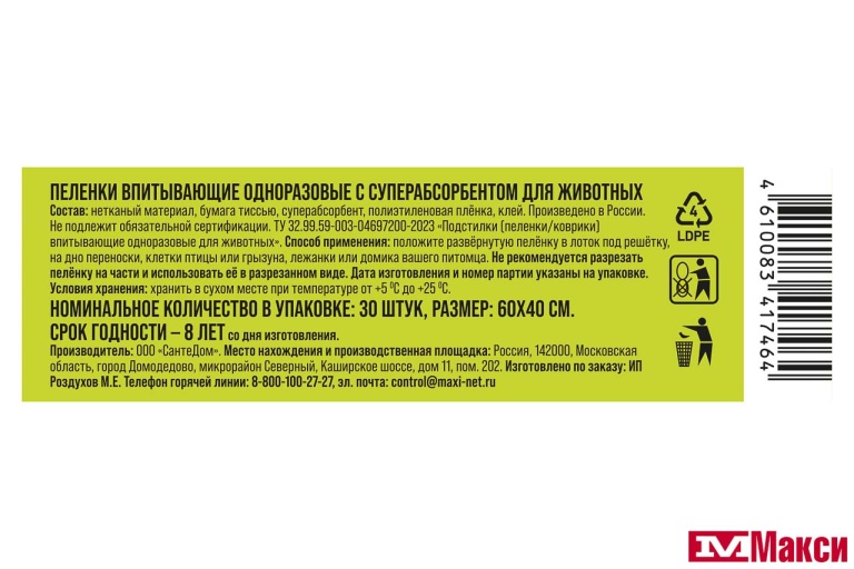 Полиэтиленовое основание исключает протекание жидкости, нетканый материал оставляет поверхность сухой, впитывающий слой надежно удерживает влагу и запах, а суперабсорбент превращает жидкость в гель.
