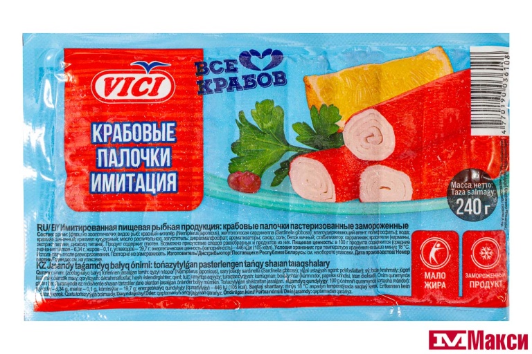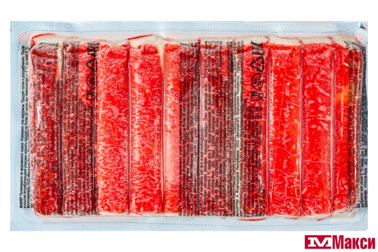 сурими (фарш рыбный из вида рыб: желтополосая сардинелла, тумбиль, из семейства рыб: нитеперые; влагоудерживающий агент: полифосфаты); вода, крахмал пшеничный; крахмал кукурузный; масло растительное; загустители (дикрахмалфосфат, конжак); ароматизаторы; сахар, соль, белок яичный, стабилизаторы: каррагинан, красители (кармины, экстракт паприки, диоксид титана). Содержит глютен. Возможно присутствие ракообразных и продуктов из них.
