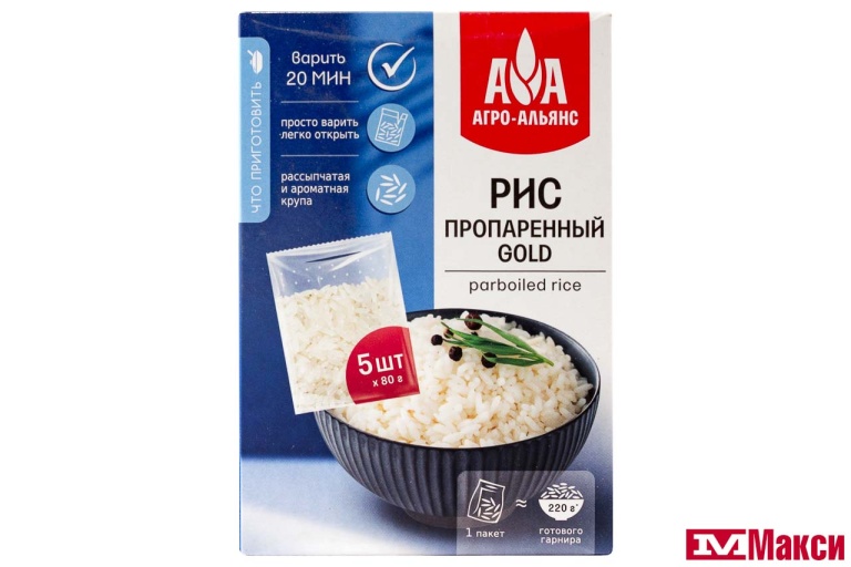 КРУПА РИС ПРОПАРЕННЫЙ GOLD 5Х80Г ВАРОЧНЫЕ ПАКЕТЫ (АГРОАЛЬЯНС)