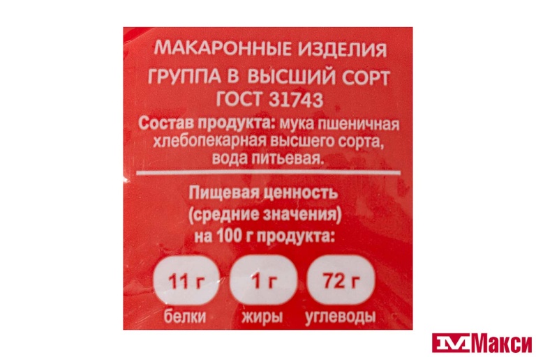 Макаронные изделия из муки твердых сортов пшеницы высшего сорта, изготовленные по ГОСТу на итальянском оборудовании, группа В.