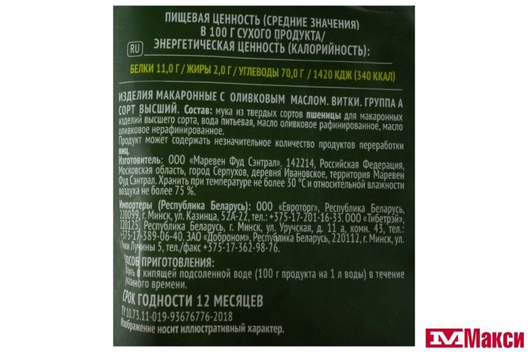 Изделия макаронные с оливковым маслом. Рожки. Группа А
