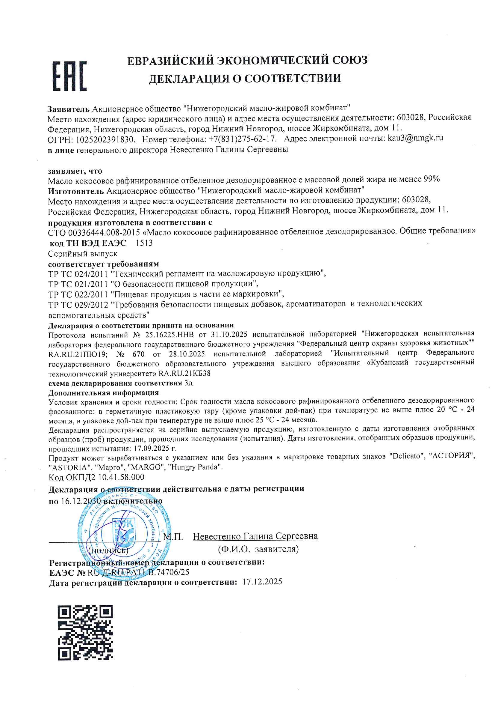 МАСЛО КОКОСОВОЕ "DELICATO" РАФИНИРОВАННОЕ 99,9% 400Г ПЛАСТИКОВЫЙ ЛОТОК (НМЖК)