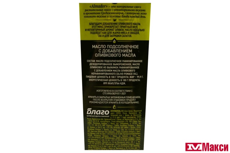 МАСЛО ПОДСОЛНЕЧНОЕ "ALMADOR" С ДОБАВЛЕНИЕМ ОЛИВКОВОГО 0,75Л (БЛАГО)