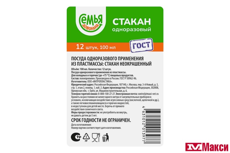СТАКАН ОДНОРАЗОВЫЙ 100МЛ 12ШТ (СЕМЬЯ ДОВОЛЬНА)