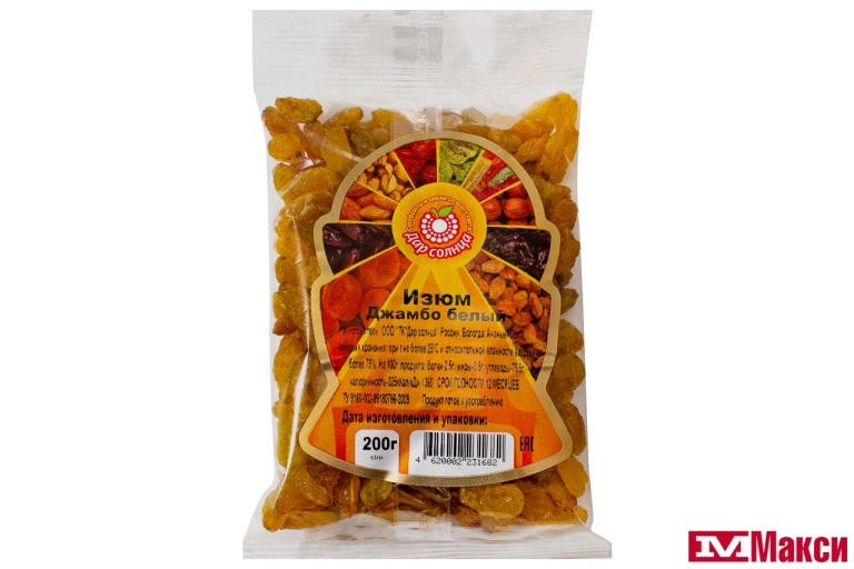 ФРУКТЫ СУШ.(ДАР СОЛНЦА) ИЗЮМ "ДЖАМБО" БЕЛЫЙ 200Г