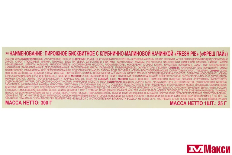 мука пшеничная общего назначения тип М 55-23, яичные продукты, фруктовый наполнитель «Клубника-малина» (сахар, клубника, агент влагоудерживающий (сорбитовый сироп), сироп глюкозный, малина, глюкоза, вода питьевая, загустители (пектины, ксантановая камедь), регуляторы кислотности (лимонная кислота, цитрат натрия 3-замещенный, цитраты кальция), антиокислитель (аскорбиновая кислота), ароматизаторы, консервант (сорбат калия), краситель (кармины)), сахар, жир специального назначения (рафинированные дезодорированные растительные масла (пальмовое, пальмоядровое), эмульгаторы (лецитин соевый), антиокислитель (концентрат смеси токоферолов)), рафинированное дезодорированное подсолнечное масло, патока, вода питьевая, агент влагоудерживающий (сорбитовый сироп), сливки сухие, комплексная пищевая добавка (вода питьевая, эмульгаторы (эфиры полиглицерина и жирных кислот, моно- и диглицериды жирных кислот, сорбитан моностеарат), агенты влагоудерживающие (пропиленгликоль, глицерин)), молоко сухое обезжиренное, спирт этиловый ректификованный из пищевого сырья, эмульгаторы (моно- и диглицериды жирных кислот, эфиры пропиленгликоля и жирных кислот, лецитин соевый, Е476), агент влагоудерживающий (глицерин), молоко сухое цельное, разрыхлитель (регуляторы кислотности (гидрокарбонат натрия, дигидропирофосфат натрия, фумаровая кислота), мука пшеничная высшего сорта)), соль, ароматизаторы, антиокислитель (аскорбиновая кислота), загуститель (ксантановая камедь), краситель (каротины), упаковочный газ (азот)