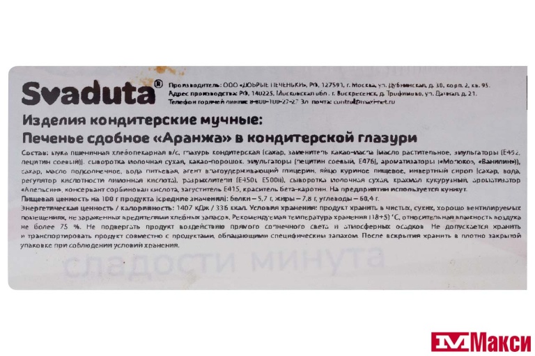 сухая, какао-порошок, эмульгаторы (лецитин соевый, Е476), ароматизаторы («Молоко», «Ванилин»)), сахар, масло подсолнечное, вода питьевая, агент влагоудерживающий глицерин, яйцо куриное пищевое, инвертный сироп (сахар, вода питьевая, регулятор кислотности лимонная кислота), разрыхлители (Е450i, Е500ii), молоко сухое, крахмал кукурузный, ароматизатор «Апельсин», консервант сорбиновая кислота, загуститель Е415, краситель каротины.