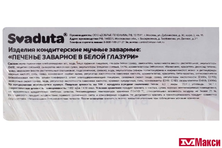мука пшеничная хлебопекарная в/с, вода питьевая, яйцо куриное пищевое, глазурь белая (сахар, заменитель какао-масла (масло растительное, эмульгаторы (Е492, лецитин соевый)), сыворотка молочная сухая, эмульгаторы (лецитин соевый, Е476), ароматизаторы («Молоко», «Ванилин»), краситель диоксид титана), сахар, маргарин (рафинированные дезодорированные растительные масла в натуральном и модифицированном виде (пальмовое, подсолнечное, соевое), вода, эмульгаторы (эфиры полиглицерина и жирных кислот, моно- и диглицериды жирных кислот), соль, сахар, консервант сорбат калия, регулятор кислотности лимонная кислота, ароматизатор, краситель каротины, антиокислители (аскорбиновая кислота,