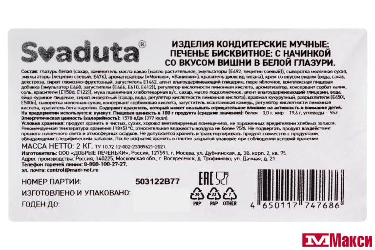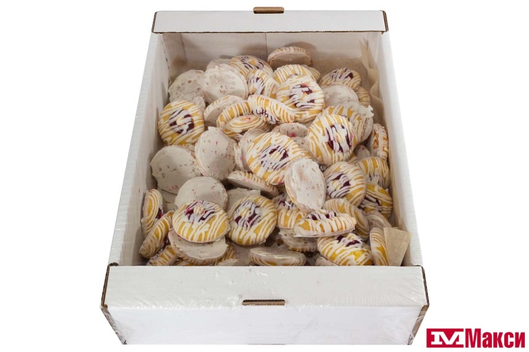 глазурь белая (сахар, заменитель масла какао (масло растительное, эмульгаторы (Е492, лецитин соевый)), сыворотка молочная сухая, эмульгаторы (лецитин соевый, Е476), ароматизаторы («Молоко», «Ванилин»), краситель диоксид титана), крем со вкусом вишни (вода, сахар, декстроза, сироп глюкозно-фруктозный, загуститель Е1442, агент влагоудерживающий глицерин, пюре яблочное, комплексная пищевая добавка (эмульгатор E460, загустители (Е466, Е410, Е412)), регулятор кислотности лимонная кислота, ароматизатор, консервант сорбат калия, соль, красители (Е150d, Е122)), мука пшеничная хлебопекарная в/с, сахар, масло подсолнечное, агент влагоудерживающий глицерин, вода, яйцо куриное пищевое, сироп инвертный (сахар, вода, регулятор кислотности лимонная кислота), крахмал кукурузный, разрыхлители (Е450i, Е500ii), сыворотка молочная сухая, консервант сорбиновая кислота, загуститель ксантановая камедь, регулятор кислотности лимонная кислота, краситель бета-каротин
