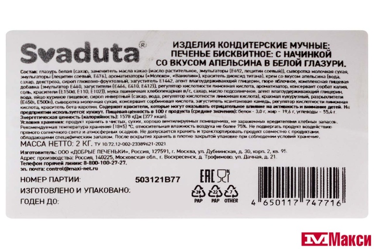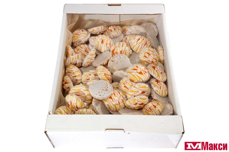 глазурь белая (сахар,заменитель масла какао (масло растительное,эмульгаторы (Е492,лецитин соевый)), сыворотка молочная сухая, эмульгаторы (лецитин соевый Е476), ароматизаторы ("Молоко", "Ванилин"), краситель диоксид титана), крем со вкусом апельсина (вода добавлена (эмульгатор Е460, загустители (Е466, Е410, Е412)),регулятор кислотности лимонная кислота, ароматизатор, консервант сорбат калия,соль, красители (Е150d, Е110, Е102),мука пшеничная хлебопекарная в/с, сахар, масло подсолнечное, агент влагоудерживающий глицерин, вода, яйцо куриное пищевое, сироп инвертный сироп (сахар, вода питьевая, регулятор кислотности лимонная кислота), крахмал кукурузный, разрыхлители (Е450i, Е500ii), молоко сухое, консервант сорбиновая кислота, загуститель Е415, регулятор кислотности лимонная кислота, краситель каротины.