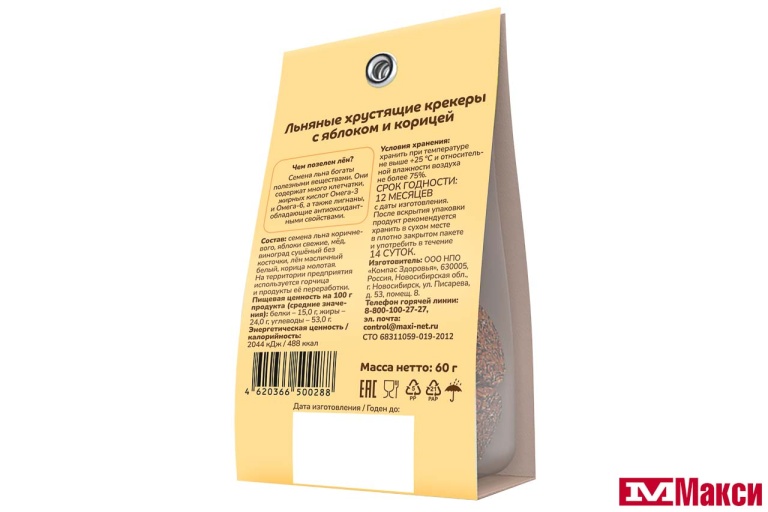 КРЕКЕРЫ "ПРОПОЛЬЗУ" ЛЬНЯНЫЕ С ЯБЛОКОМ И КОРИЦЕЙ 60Г