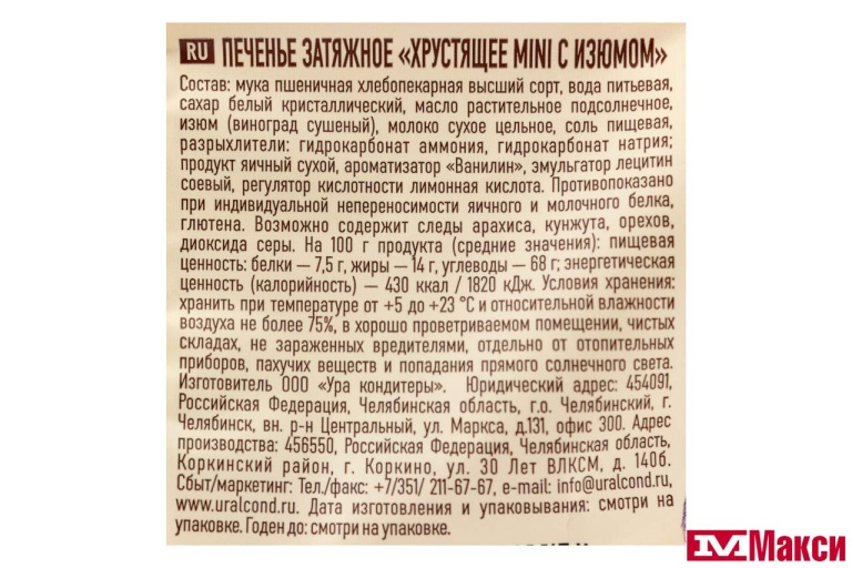 мука пшеничная хлебопекарная высший сорт, вода питьевая, сахар белый кристаллический, масло растительное подсолнечное, изюм (виноград сушеный), молоко сухое цельное, соль пищевая, разрыхлители: гидрокарбонат аммония, гидрокарбонат натрия; продукт яичный сухой, ароматизатор «Ванилин», эмульгатор лецитин соевый, регулятор кислотности лимонная кислота