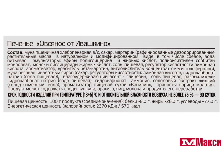 мука пшеничная хлебопекарная в/с, сахар, маргарин (рафинированные дезодорированные растительные масла в натуральном и модифицированном виде, в том числе соевое, вода питьевая, эмульгаторы: эфиры полиглицерина и жирных кислот, полиоксиэтилен сорбитан моноолеат, моно- и диглицериды жирных кислот, соль пищевая, регулятор кислотности лимонная кислота, ароматизатор, краситель бета-каротин, антиокислитель концентрат смеси токоферолов), мука овсяная, инвертный сироп (сахар, регуляторы кислотности: лимонная кислота, гидрокарбонат натрия (сода пищевая)), влагоудерживающий агент - глицерин, соль пищевая, разрыхлители: гидрокарбонат натрия (сода пищевая), гидрокарбонат аммония, солодовый экстракт жидкий (солод ячменный, вода), ароматизатор пищевой сухой «Ванилин», пряность: корица молотая