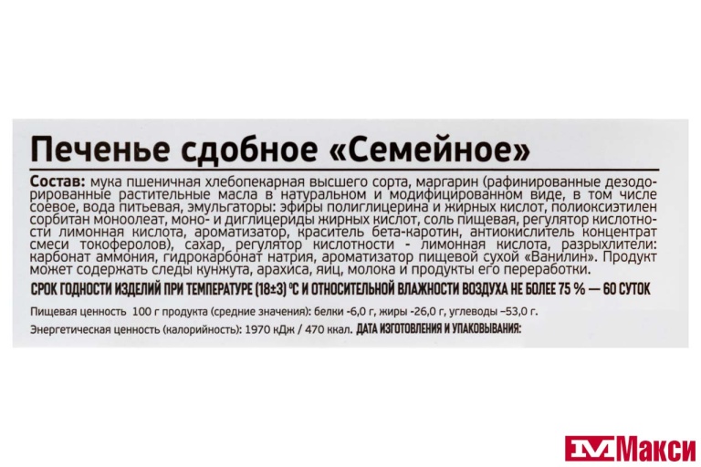 мука пшеничная хлебопекарная в/с, маргарин (рафинированные дезодорированные растительные масла в натуральном и модифицированном виде, в том числе соевое, вода питьевая, эмульгаторы: эфиры полиглицерина и жирных кислот, полиоксиэтилен сорбитан моноолеат, моно- и диглицериды жирных кислот, соль пищевая, регулятор кислотности лимонная кислота, ароматизатор, краситель бета-каротин, антиокислитель концентрат смеси токоферолов), сахар, регулятор кислотности - лимонная кислота, разрыхлители: карбонат аммония, гидрокарбонат натрия, ароматизатор пищевой сухой «Ванилин»