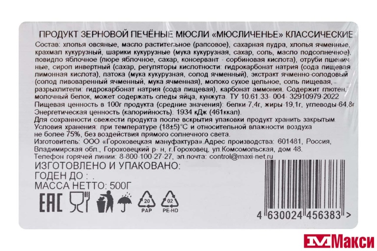 ПРОДУКТ ЗЕРНОВОЙ "МЮСЛИЧЕНЬЕ" КЛАССИЧЕСКИЕ 500Г (ПРОПОЛЬЗУ)