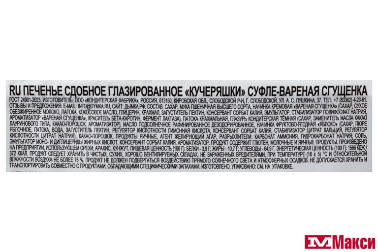 сахар, мука пшеничная высшего сорта, начинка кремовая «вареная сгущенка» (сахар, сухое обезжиренное молоко, патока, кокосовое масло, глицерин, крахмал, загуститель пектин, консервант сорбат калия, эмульгатор, стабилизатор полифосфат натрия, ароматизатор «вареная сгущенка», краситель бета-каротин, фермент лактаза), патока крахмальная, глазурь кондитерская тёмная (сахар, заменитель масла какао лауринового типа, какао-порошок, ароматизатор), масло подсолнечное рафинированное дезодорированное, начинка фруктово-ягодная «яблоко» (сахар, пюре яблочное, патока, вода, загуститель пектин, регулятор кислотности лимонная кислота, консервант сорбат калия, стабилизатор цитрат кальция, регулятор кислотности цитрат натрия), какао-порошок, продукты яичные, агент желирующий агар, разрыхлители: карбонат аммония, гидрокарбонат натрия; соль, эмульгатор моно-и диглицериды жирных кислот, консервант сорбат калия, ароматизатор