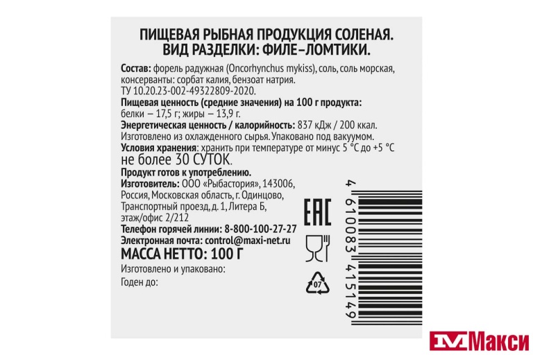 форель радужная (Oncorhynchus mykiss), соль, консерванты: бензоат натрия, сорбат калия
