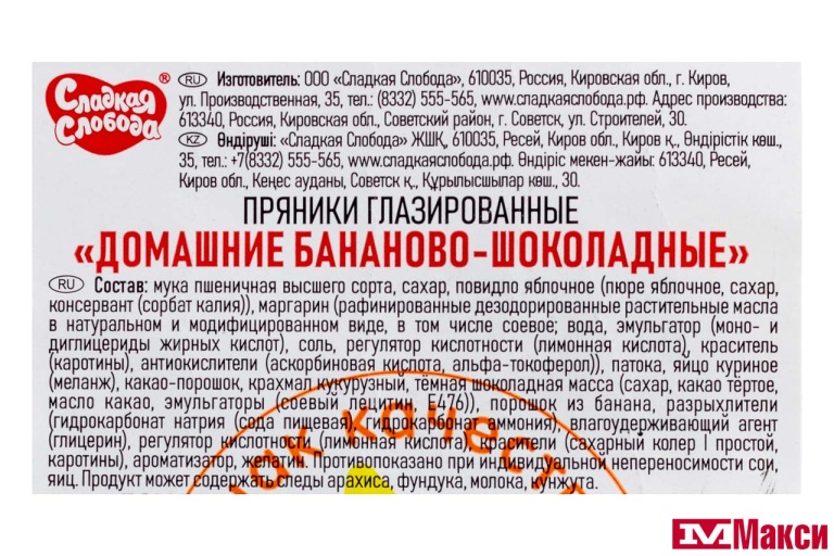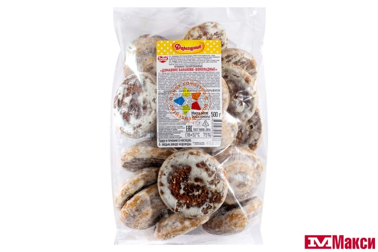 мука пшеничная высшего сорта, сахар, повидло яблочное (пюре яблочное, сахар, консервант (сорбат калия)), маргарин (рафинированные дезодорированные растительные масла в натуральном и модифицированном виде, в том числе соевое; вода, эмульгатор (моно- и диглицериды жирных кислот), соль, регулятор кислотности (лимонная кислота), краситель (каротины), антиокислители (аскорбиновая кислота, альфа-токоферол)), патока, яйцо куриное (меланж), какао-порошок, крахмал кукурузный, тёмная шоколадная масса (сахар, какао тёртое, масло какао, эмульгаторы (соевый лецитин, Е476)), порошок из банана, разрыхлители (гидрокарбонат натрия (сода пищевая), гидрокарбонат аммония), влагоудерживающий агент (глицерин), регулятор кислотности (лимонная кислота), красители (сахарный колер I простой, каротины), ароматизатор, желатин