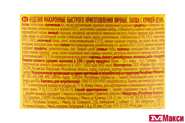Лапша (мука пшеничная в/с, масло растительное, крахмал кукурузный и тапиоковый, вода питьевая, соль, яичный порошок, загуститель (гуаровая камедь), стабилизатор (карбонат калия), разрыхлитель (сода пищевая), регулятор кислотности (лимонная кислота), усилитель вкуса и аромата (Е621), бульон-приправа (соль, заменитель сухих сливок на растительной основе (глюкозный сироп, масло растительное, молочный белок, стабилизаторы (Е340, Е452), эмульгаторы (Е471, Е481), агент антислеживающий (Е551), сушеные овощи и зелень (морковь, лук зеленый, чеснок, петрушка), мальтодекстрин, усилители вкуса и аромата (Е621, Е635), соевый текстурат, крахмал кукурузный, ароматизаторы, кукуруза сушеная, соус соевый сухой (соевые бобы, пшеница, мальтодекстрин, соль), сахар, мясо курицы сушеное, перец черный, куркума, пальмовый олеин, регулятор кислотности (лимонная кислота), агент антислеживающий (Е551).