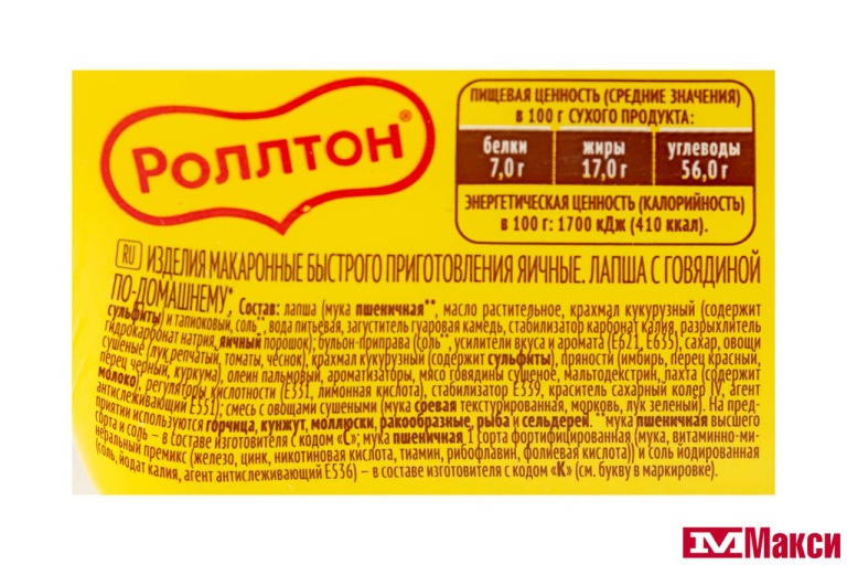 Лапша (мука пшеничная в/с, масло растительное, крахмал кукурузный и тапиоковый, вода питьевая, соль, яичный порошок, загуститель (гуаровая камедь), стабилизатор (карбонат калия), разрыхлитель (сода пищевая), регулятор кислотности (лимонная кислота), усилитель вкуса и аромата (Е621));