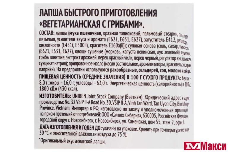 Лапша (мука пшеничная, крахмал тапиоковый, пальмовый стеарин, соль, вода питьевая, усилители вкуса и аромата (Е621, Е631, Е627), загуститель Е412, регуляторы кислотности (Е451i, Е500ii), краситель Е160а(ii)растительные каротины); суповая основа (соль, сахар, усилители вкуса и аромата (Е621, Е631, Е627), овощи сушеные (морковь, капуста пекинская, лук зеленый), сушеные грибы шиитаке, экстракт дрожжей, перец красный чили, перец черный, регулятор кислотности сукцинат натрия); приправочное масло (масло растительное, ароматизаторы, краситель экстракт паприки). На предприятии используются ракообразные, сельдерей, соя, молоко и яйца.