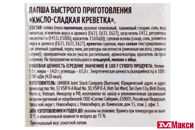 Лапша (мука пшеничная, крахмал тапиоковый, пальмовый стеарин, соль, вода питьевая, усилители вкуса и аромата (Е621, Е631, Е627), загуститель Е412, регуляторы кислотности (Е451i, Е500ii), краситель Е160а(ii)растительные каротины); суповая основа (соль, сахар, усилители вкуса и аромата (Е621, Е631, Е627), овощи сушеные (морковь, капуста пекинская, лук зеленый), сушеные грибы шиитаке, экстракт дрожжей, перец красный чили, перец черный, регулятор кислотности сукцинат натрия); приправочное масло (масло растительное, ароматизаторы, краситель экстракт паприки). На предприятии используются ракообразные, сельдерей, соя, молоко и яйца.