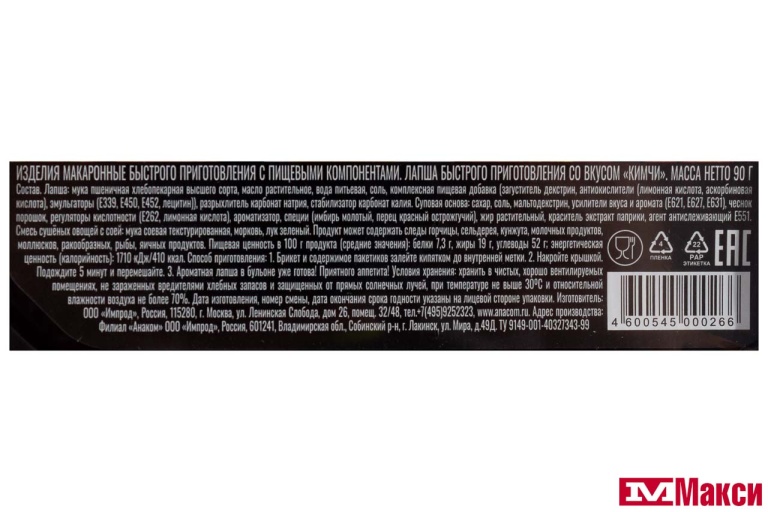 лапша: мука пшеничная хлебопекарная высшего сорта, масло пальмовое, вода питьевая, соль, комплексная пищевая добавка (загуститель декстрин, антиокислители (лимонная кислота, аскорбиновая кислота), эмульгаторы (Е339, Е450, Е452, лецитин)), разрыхлитель карбонат натрия, стабилизатор карбонат калия.