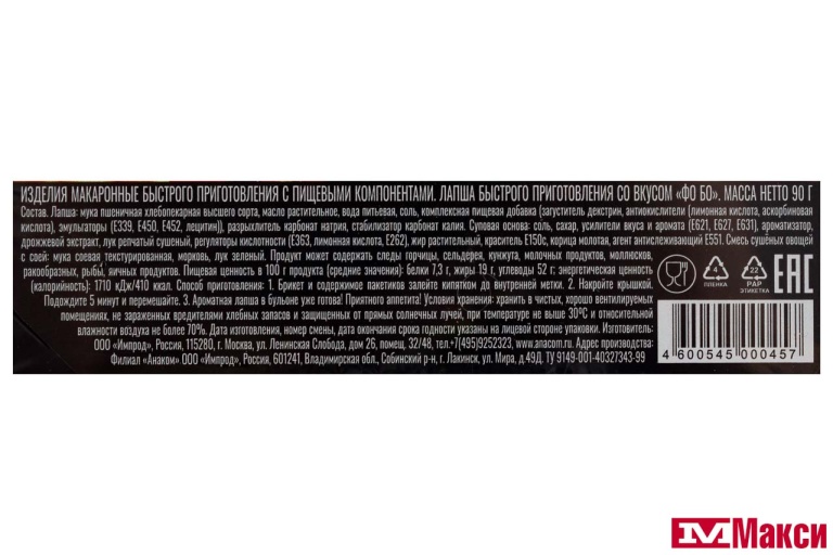 лапша: мука пшеничная хлебопекарная высшего сорта, масло пальмовое, вода питьевая, соль, комплексная пищевая добавка (загуститель декстрин, антиокислители (лимонная кислота, аскорбиновая кислота), эмульгаторы (Е339, Е450, Е452, лецитин)), разрыхлитель карбонат натрия, стабилизатор карбонат калия.