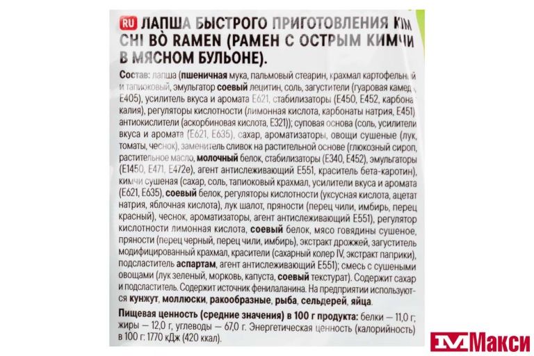 лапша (пшеничная мука, пальмовый стеарин, крахмал картофельный и тапиоковый, эмульгатор соевый лецитин, соль, загустители (гуаровая камедь, E405), усилитель вкуса и аромата Е621, стабилизаторы (Е450, Е452, карбонат калия), регуляторы кислотности (лимонная кислота, карбонаты натрия, Е451), антиокислители (аскорбиновая кислота, Е321)); суповая основа (соль, усилители вкуса и аромата (Е621, Е635), сахар, ароматизаторы, овощи сушеные (лук, томаты, чеснок), заменитель сливок на растительной основе (глюкозный сироп, растительное масло, молочный белок, стабилизаторы (Е340, Е452), эмульгаторы (E1450, E471, E472e), агент антислеживающий Е551, краситель бета-каротин), кимчи сушеная (сахар, соль, тапиоковый крахмал, усилители вкуса и аромата (Е621, Е635), соевый белок, регуляторы кислотности (уксусная кислота, ацетат натрия, яблочная кислота), лук шалот, пряности (перец чили, имбирь, перец красный), чеснок, ароматизаторы, агент антислеживающий Е551), регулятор кислотности лимонная кислота, соевый белок, мясо говядины сушеное